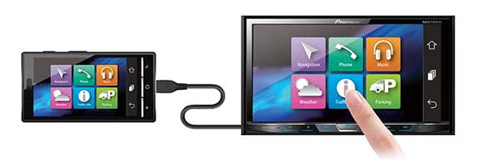 El AppRadio Mode revoluciona la manera en que el conductor utiliza su teléfono inteligente, colocando en el tablero de instrumentos las apps compatibles de iPhone 5s, iPhone 5c, iPhone 5, iPhone 4S*, iPhone 4*, iPod touch de quinta generación, iPod touch de cuarta* generación o Android**.